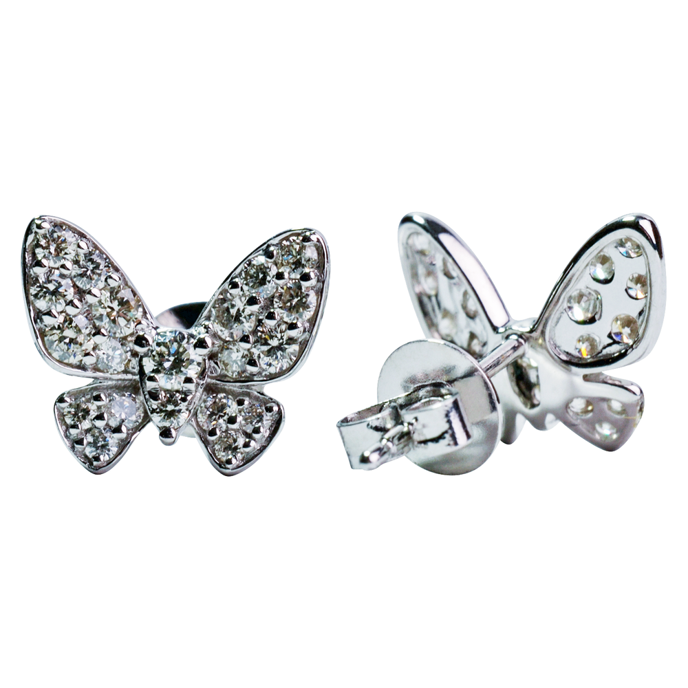 his pair of Diamond post earrings made in the shape of butterflies. These diamond earrings have a total carat weight of 0.56 carats and measure approximately 0.45 inches wide by 0.35 inches tall. The 18K gold has a weight of 1.50 grams.