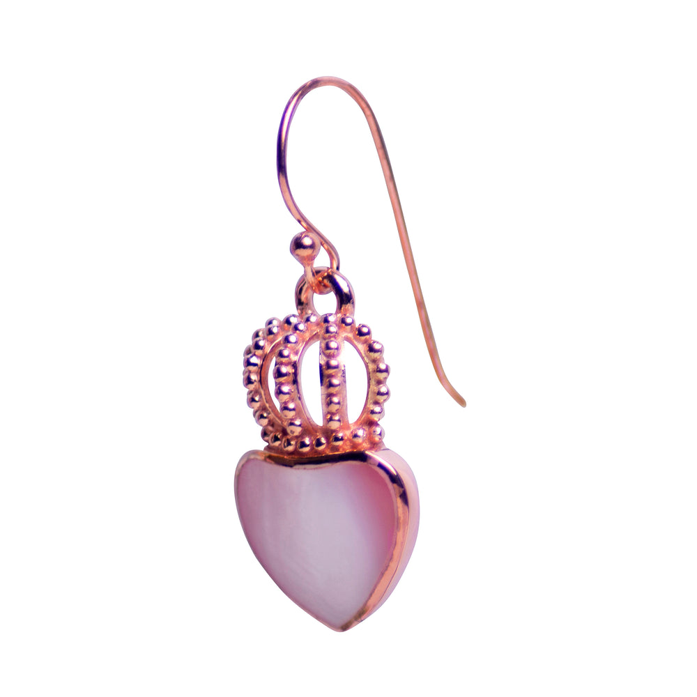 A highly detailed 18K rose gold over sterling silver crown adorns a hand cut gold mother of pearl heart to create these positively royal earrings. Each earring has a drop of approximately 1.15 inches and is 0.48 inches wide. These earrings have a classic fishhook backing.
