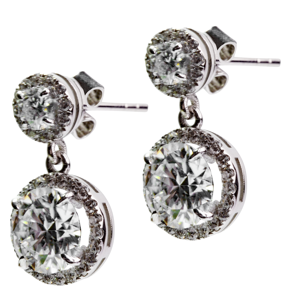These are double halo and dangle round stud earrings feature 2.20 grams of 14K white gold and 2 TCW Moissanite stones. Each Moissanite stone is 1 carat in size (2 total carats) and center set with four prongs. There are 100 Moissanite stones around the larger Moissanite stones creating the ideal halo effect.