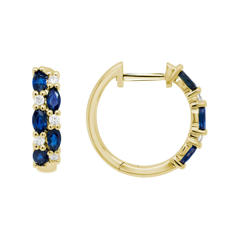 14K gold earrings. 17mm (length) x 2.2mm (width) blue sapphire and diamond huggies with snap-post closure. 6 marquise blue sapphires totaling 0.72ct.; 4 round full-cut diamonds totaling 0.06ct. Prong-set.