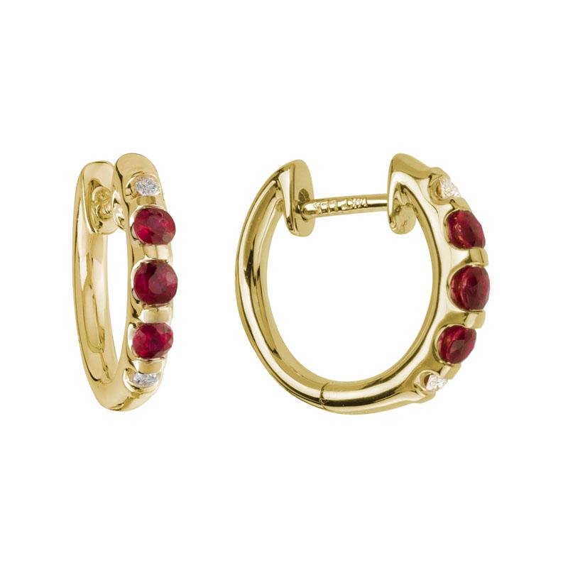 14K gold earrings. 17mm (length) x 4.1mm (width) and featuring a double row ruby and diamond huggies with snap-post closure.