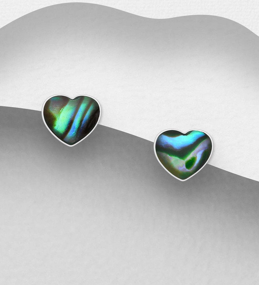 These earrings are classic heart shape Abalone shells. They are set in rhodium over sterling silver with a push-back style closure.