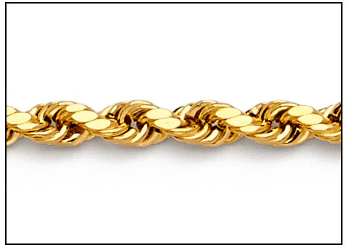 This is a 10K semi solid 3.0 mm rope diamond cut bracelet chain. It comes with a lobster clasp for added security. This is made in Northern Italy, where the finest chains in the world are made.