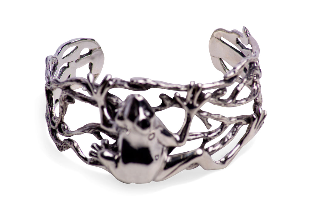 This large cuff Frog braclet is hinged for easy wear. This cuff-bracelet is made by hand exclusively for SilverAndGold - and it comes with an antiqued patina to showcase the highlights and lowlights of the design. The patina is applied by hand.