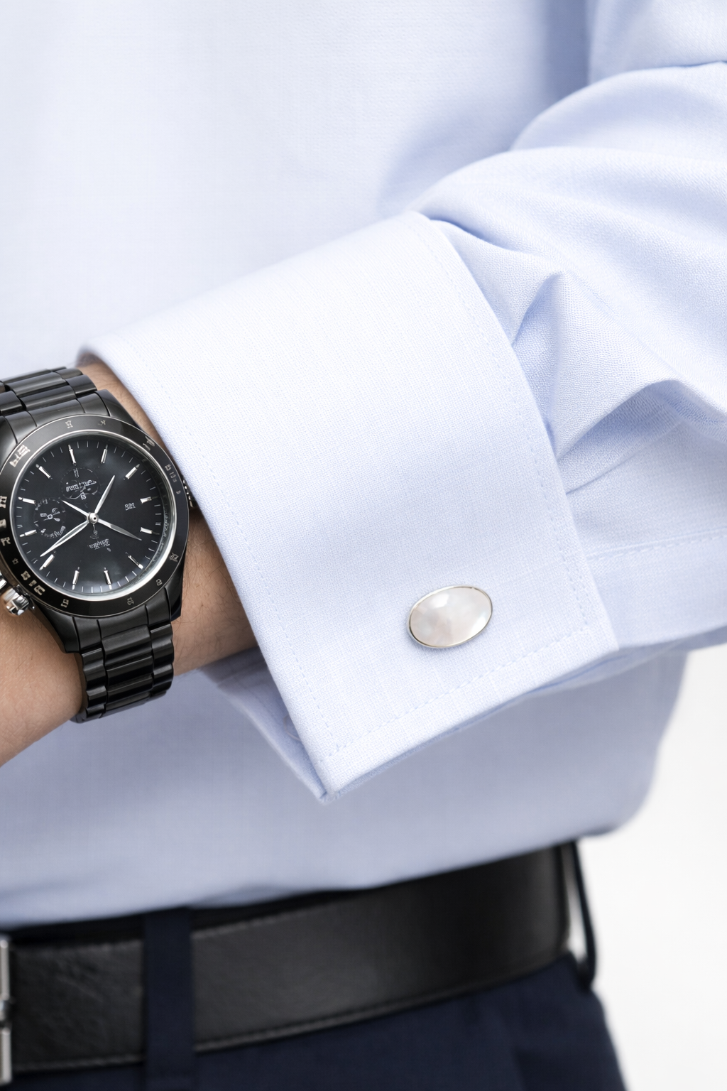 Each cufflink showcases a natural mother of pearl surface, prized for its luminous beauty and subtle iridescence. As light reflects across the surface, delicate tones of white, ivory, and soft silver emerge, creating a graceful shimmer that adds depth and elegance to the design. The smooth oval shape enhances the natural brilliance of the pearl while maintaining a clean and understated appearance.