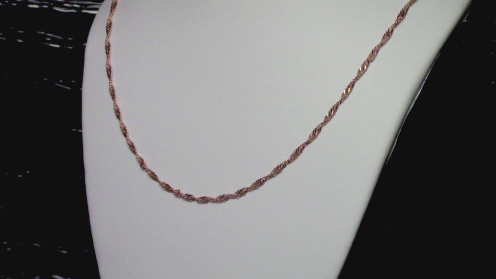 This is an 18K rose gold sterling silver twisted curb Singapore rope chain. It comes with a ring clasp for added security. This is made in Northern Italy, where the finest chains in the world are made.