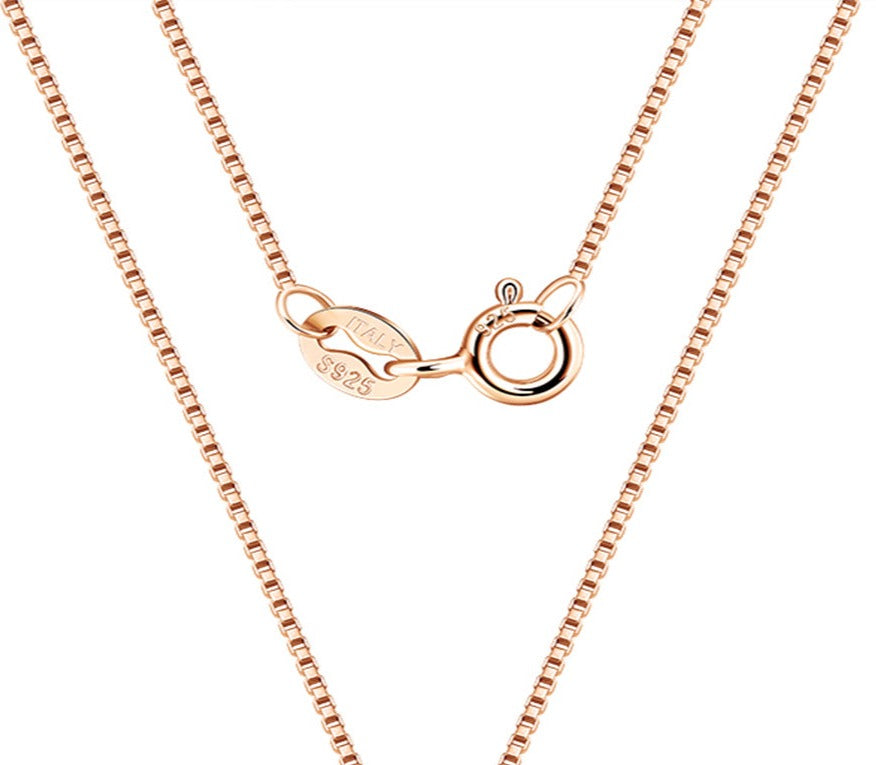 This gives each link the appearance of being a small box. This is a rose gold over sterling silver box chain. It comes with a ring clasp for added security. This is made in Northern Italy, where the finest chains in the world are made.