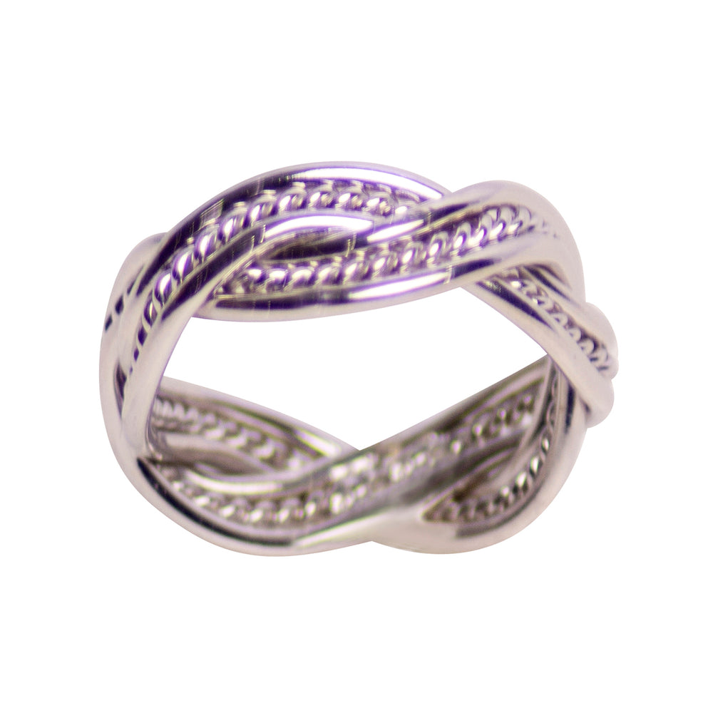 This handsome rhodium over sterling silver ring features a double twist design - a thin twist set in the larger twist of the ring. This ring is available in several sizes and is the band is approximately 0.31 inches wide.