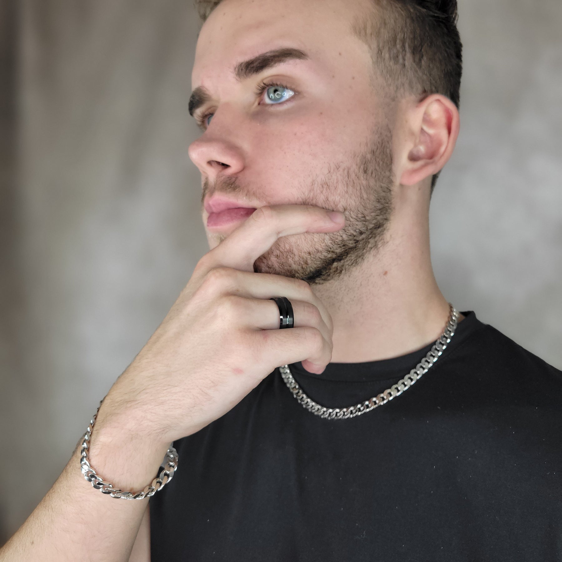 This bold and modern ring is crafted from tungsten carbide, a material renowned for its exceptional strength, durability, and resistance to scratches. Designed for those who appreciate both style and performance, the ring features a sleek black finish that gives it a contemporary and sophisticated appearance. The deep, rich color creates a striking presence while maintaining a clean, minimalist look that pairs well with both casual and formal attire.
