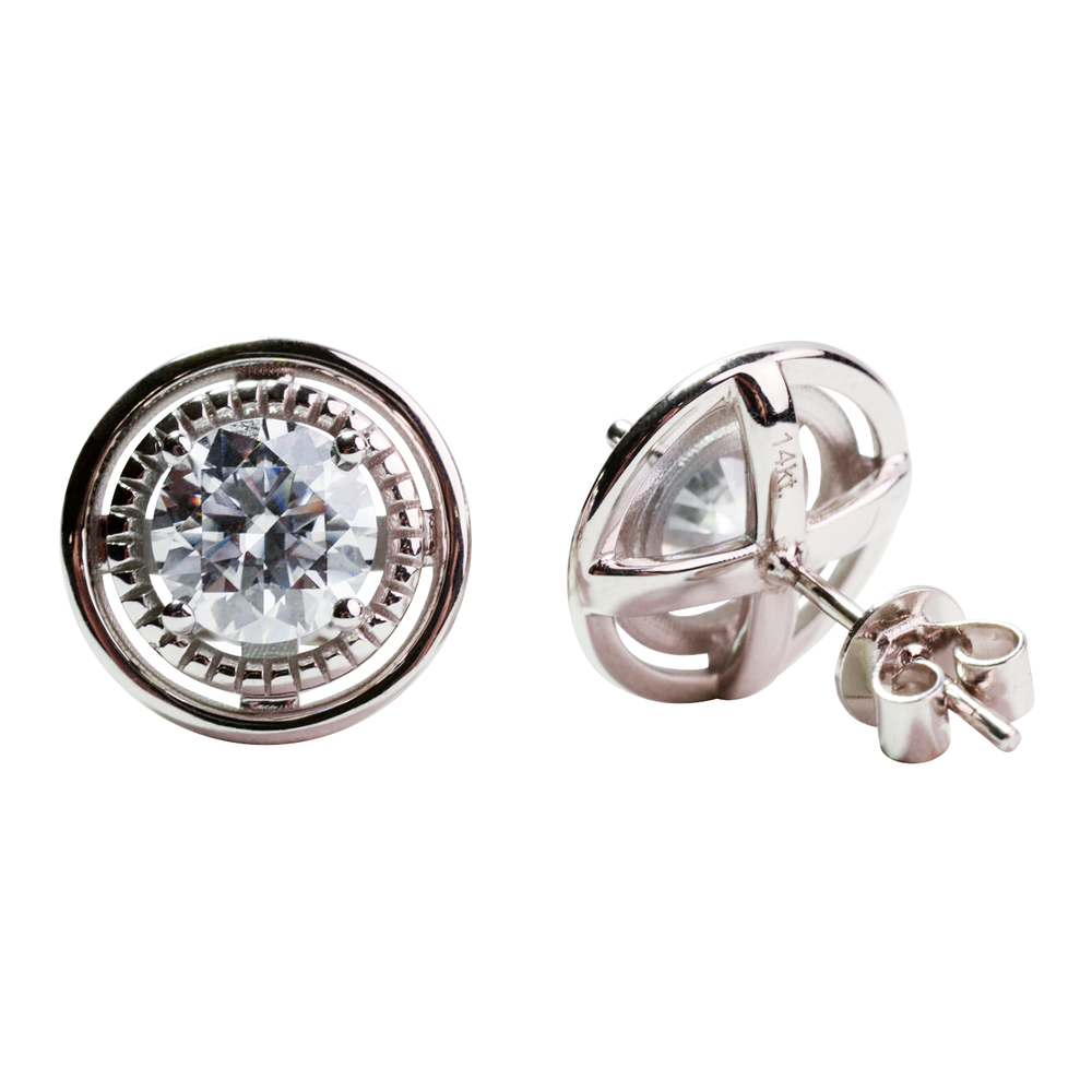 These classic round stud earrings feature 3.48 grams of 14K white gold and 2 TCW Moissanite stones. Each brilliant cut Moissanite stone is 1 carat in size (2 total carats) and center set with four prongs. The Moissanite stones are of the highest quality and graded as a color of D (ideal, colorless) with a double refraction. The clarity of these stones is IF to VVS1. These gorgeous earrings are marked 14kt and 585 for 14K gold.