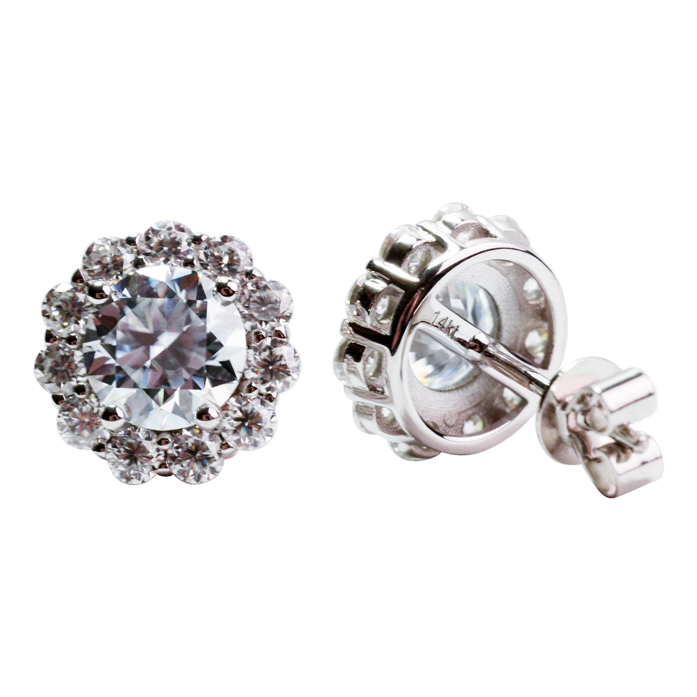 These classic round stud earrings feature 2.61 grams of 14K white gold and 2 TCW Moissanite stones. Each Moissanite stone is 1 carat in size (2 total carats) and center set with four prongs. There are 22 Moissanite stones around the larger Moissanite stone creating the ideal halo effect. These gorgeous earrings are marked 585 for 14K gold. and the white gold is Rhodium plated for added durability. The Moissanite stones are of the highest quality and graded as a color of D (ideal, colorless) with a double refraction. The clarity of these stones is IF to VVS1.