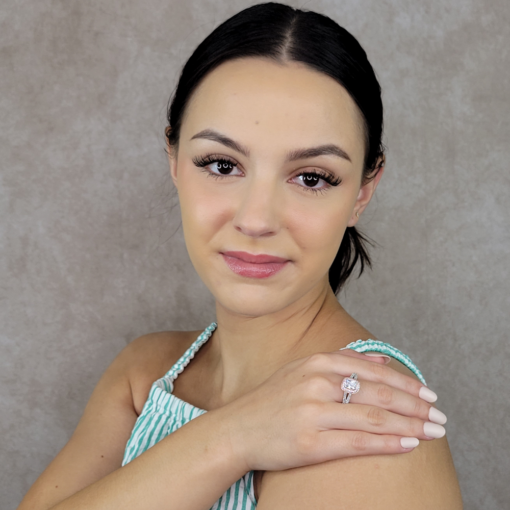 This highly detailed Emerald Cut stone ring has a 1.06 Carat center stone. It is surrounded by 178 prong-set Cubic Zirconia stones in both clear and pink. This setting also features a band of 14K Rose Gold plating over Sterling Silver. The ring is marked 925 for Sterling Silver.