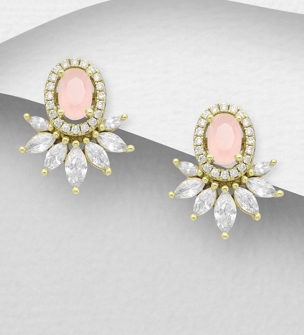 These earrings are made in sterling silver coated with 14K yellow gold. The primary gemstone is a pink diamond simulant.