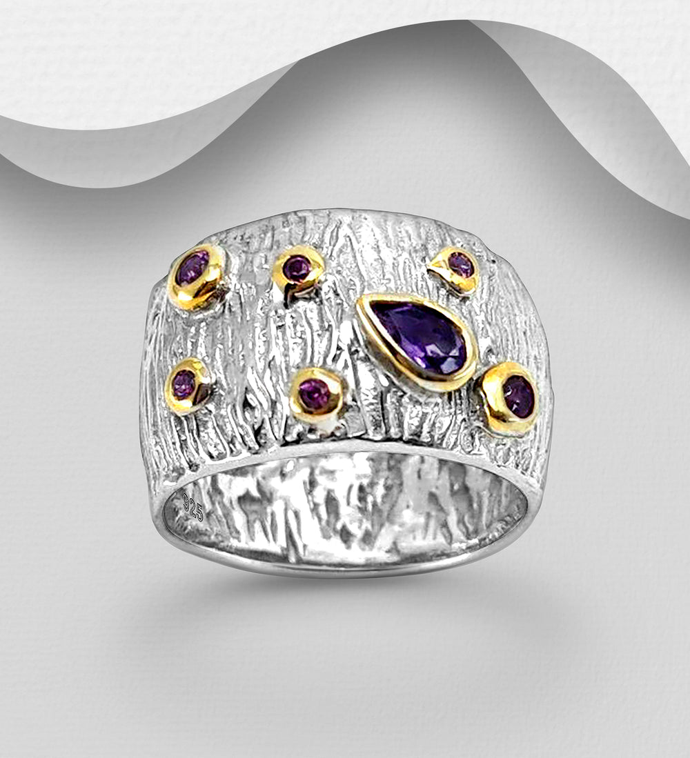 This is a sterling silver ring coated with white rhodium for luster and durability accented with 22K yellow gold. The gemstones are amethyst and rhodolite garnet.