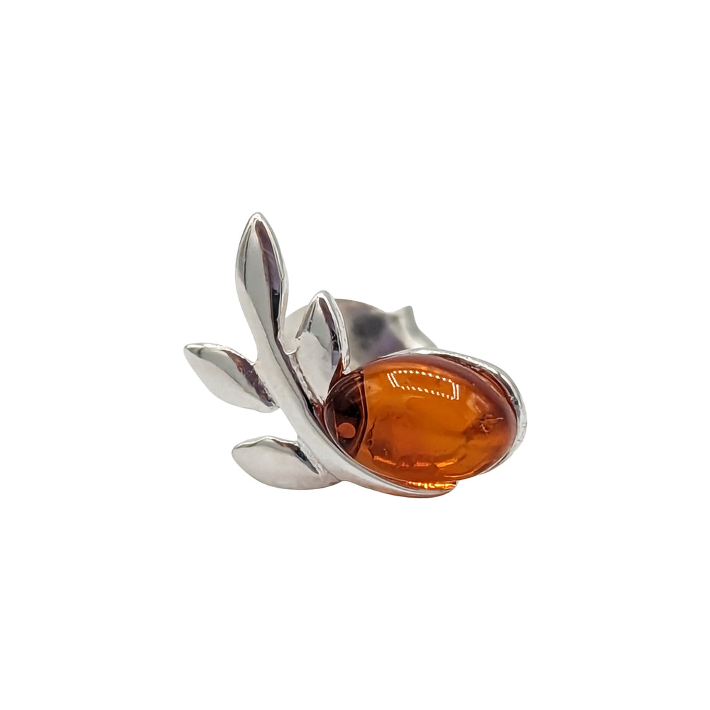 These leaf shape earrings each feature a sparkling Baltic Amber gemstone set in sterling silver. Each earring measures approximately 5 mm by 10 mm and has a push back closure.