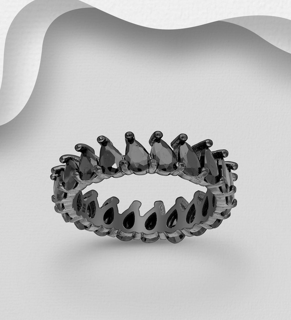 Pear shaped black diamond simulants are set in sterling silver coated in black rhodium for a dark, mysterious eternity ring you'll love.