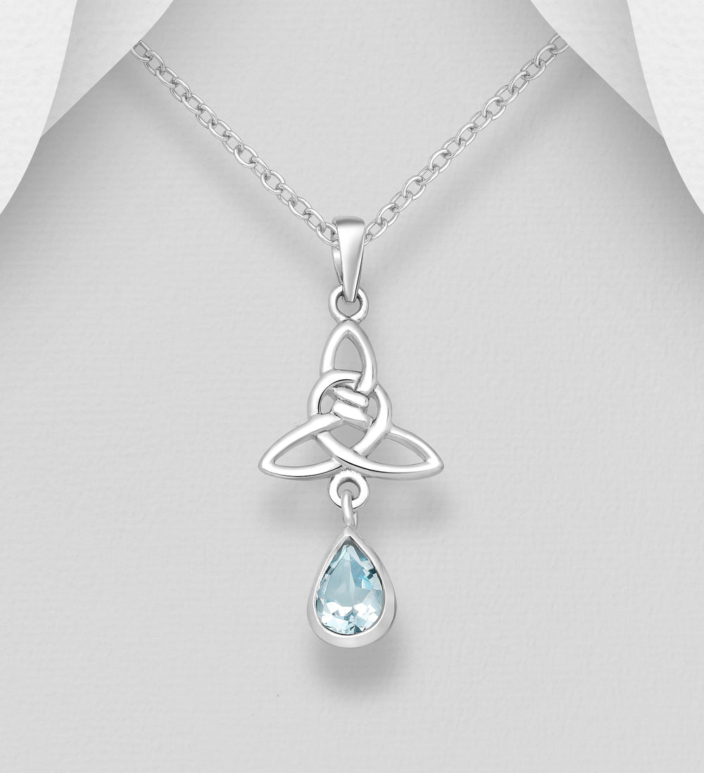 This Celtic Trinity style pendant features a teardrop shaped sky blue Topaz gemstone set in sterling silver. This pendant measures approximately 12.5 mm by 31 mm and comes with a 16 inch box chain included.