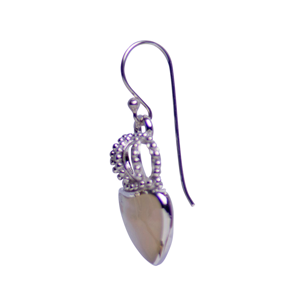 A highly detailed crown adorns a hand cut white mother of pearl heart set in rhodium over sterling silver to create these positively royal earrings. Each earring has a drop of approximately 1.15 inches and is 0.48 inches wide. These earrings have a classic fishhook backing.
