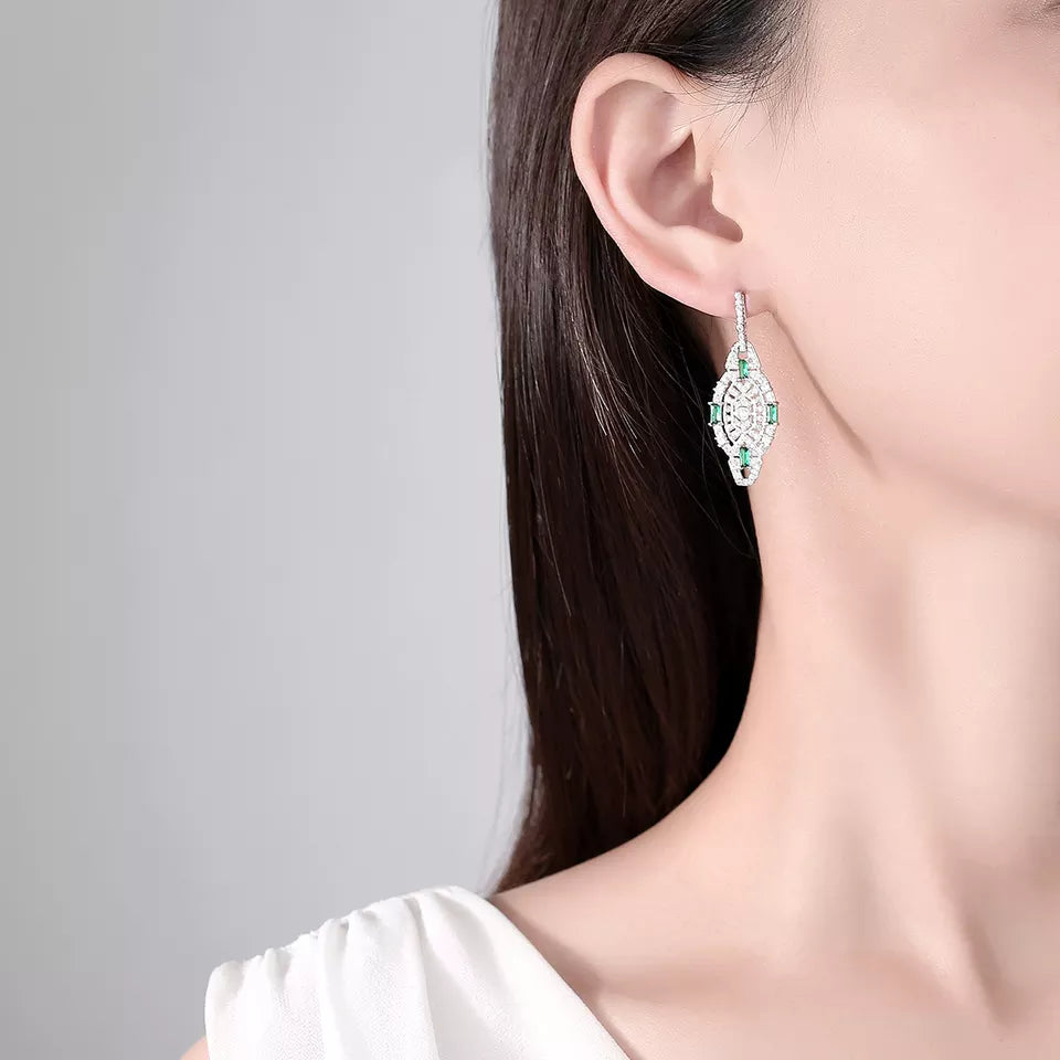 These art deco style earrings feature emerald and diamond simulants set in rhodium over copper alloy.