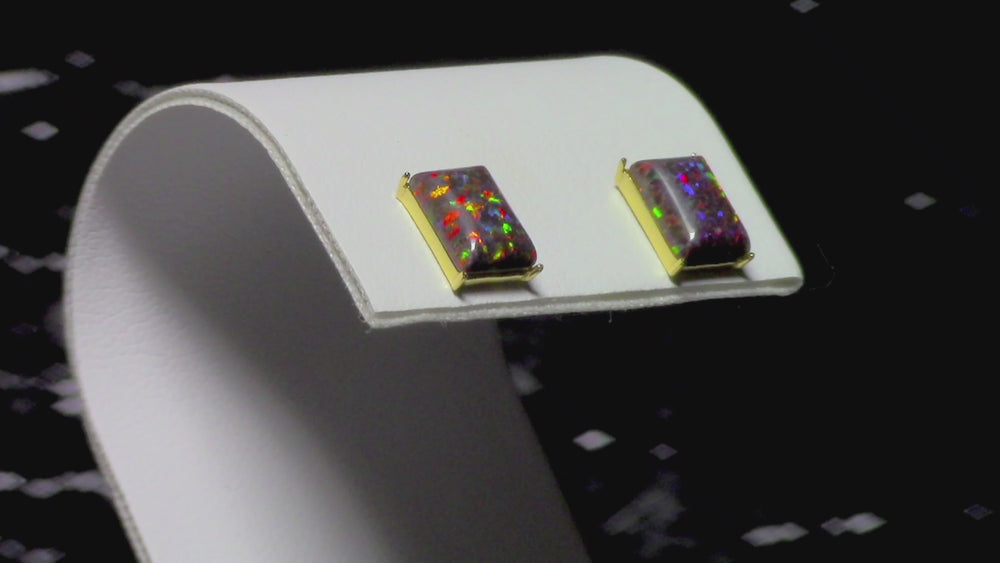 These fire opals boast flashes of reds, oranges, and yellows accented with a yellow gold finish.