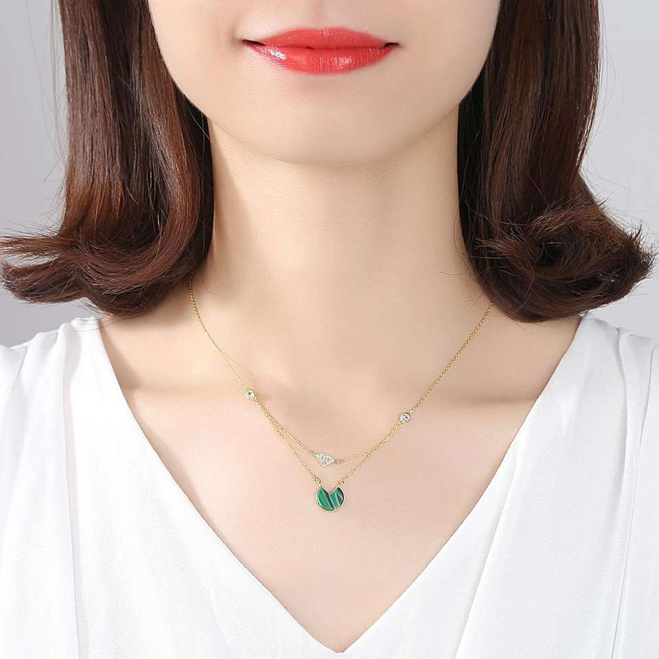 This necklace has a base of sterling silver coated with 14K yellow gold. The primary gemstone is simulated malachite and the accents are simulated diamonds.