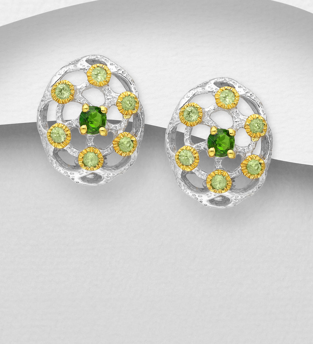These are sterling silver earrings coated in white rhodium and 22K yellow gold. The central gemstone is chrome diopside and the accent stones are peridot.