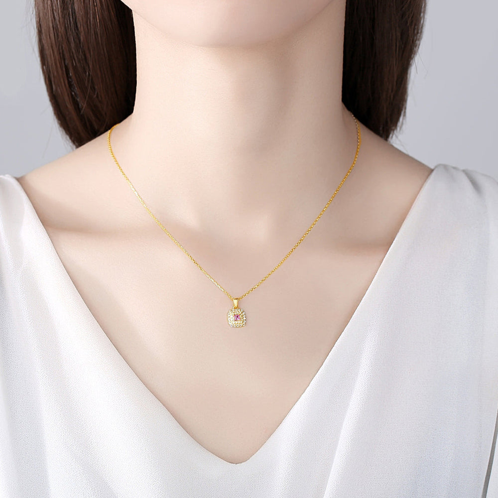 A double halo pendant showcases two rows of diamond simulants surrounding a princess cut pink diamond simulant. This pendant is made in yellow gold over sterling silver.