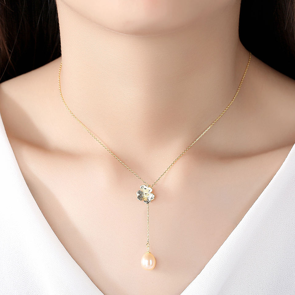 This pendant is made in sterling silver with a 14K yellow gold coating and features a 7 mm to 8 mm freshwater pink pearl.