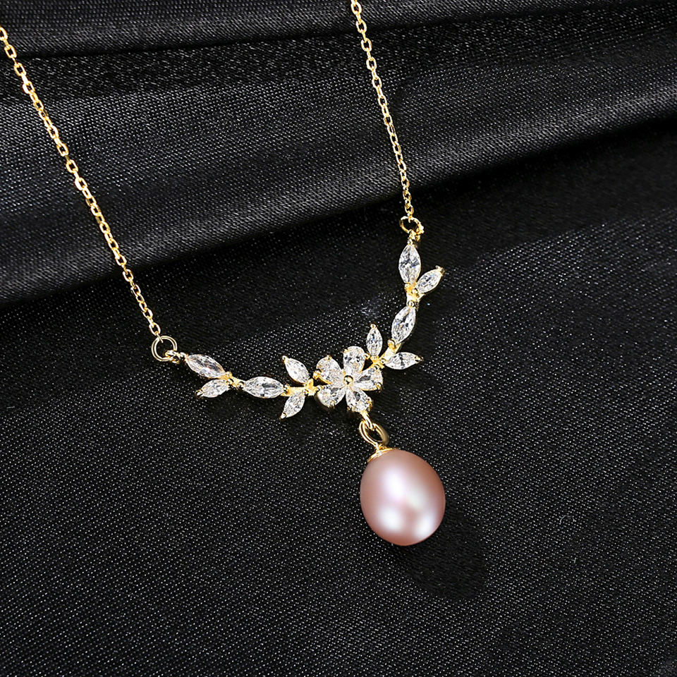 This pendant is made in sterling silver with a 14K yellow gold coating and features a 8 mm to 9 mm freshwater rosy pink pearl.