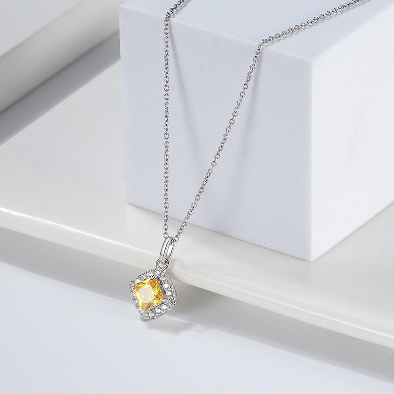 This halo pendant features a princess cut yellow diamond simulant set in sterling silver surrounded by white diamond simulants.