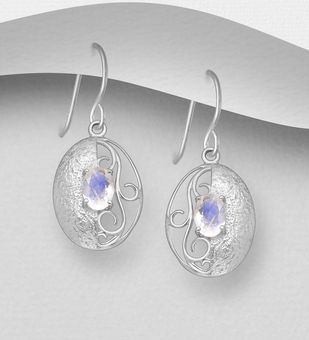 Colorful rainbow moonstones are the centerpiece of these beautiful textured matte silver earrings. These earrings have a rhodium plating which enhances luster and durability. The earrings measure 0.55 inches wide with a drop of 1.42 inches.