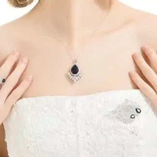 This necklace feature simulated sapphire set in white rhodium over a copper alloy.