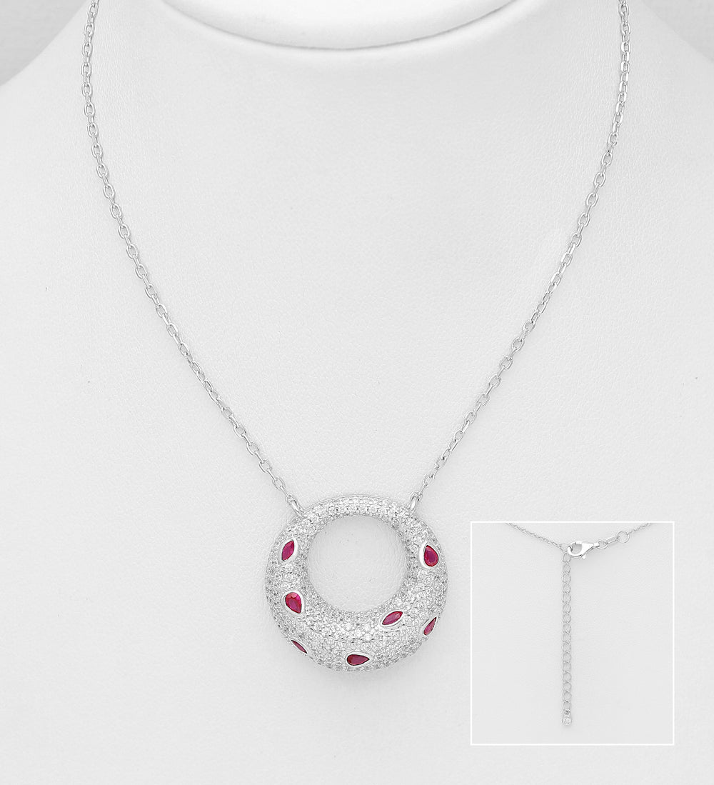 This effortlessly chic circle pendant features ruby & white simulated diamonds, rhodium over sterling silver, Measures approximately .85 inches in diameter suspending from a dainty cable chain 15.5 inch and adjustable to17.5 inches.