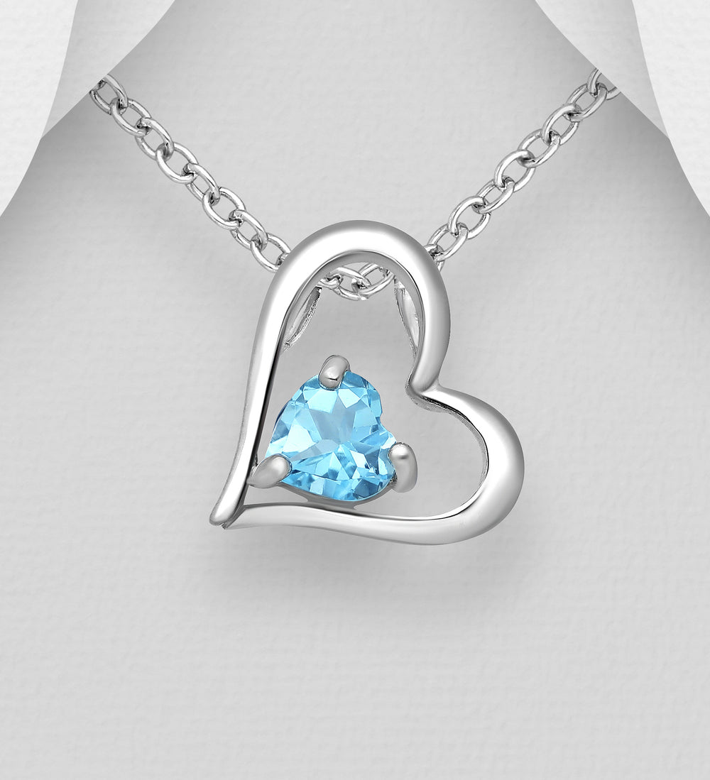 This heart pendant features a sky blue Topaz gemstone set in rhodium over sterling silver. This pendant measures approximately 14.5 mm by 15.5 mm and comes with a 16 inch box chain included.