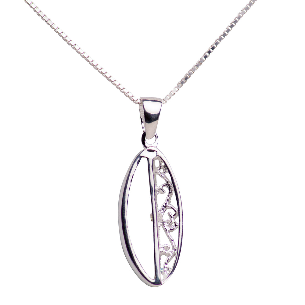 Classic sterling silver and soft blue mother of pearl come together to create this timeless pendant. This pendant measures approximately 1.2 inches (including bail) by 0.43 inches and comes complete with a 16 inch sterling silver chain.