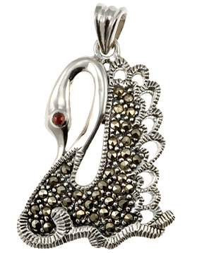 This beautiful Garnet and Marcasite Swan pendant is made with 925 sterling silver. The pendant has a drop of approximately 1 inch, and comes with a 16 inch sterling silver chain. Each pendant set comes complete in a black velvet box.