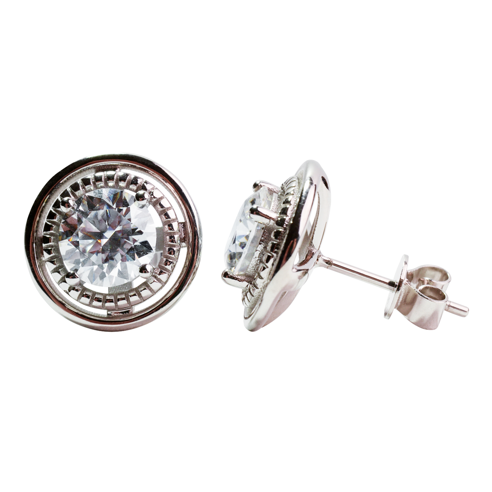 These classic round stud earrings feature 3.48 grams of 18K white gold and 2 TCW Moissanite stones. Each brilliant cut Moissanite stone is 1 carat in size (2 total carats) and center set with four prongs.
