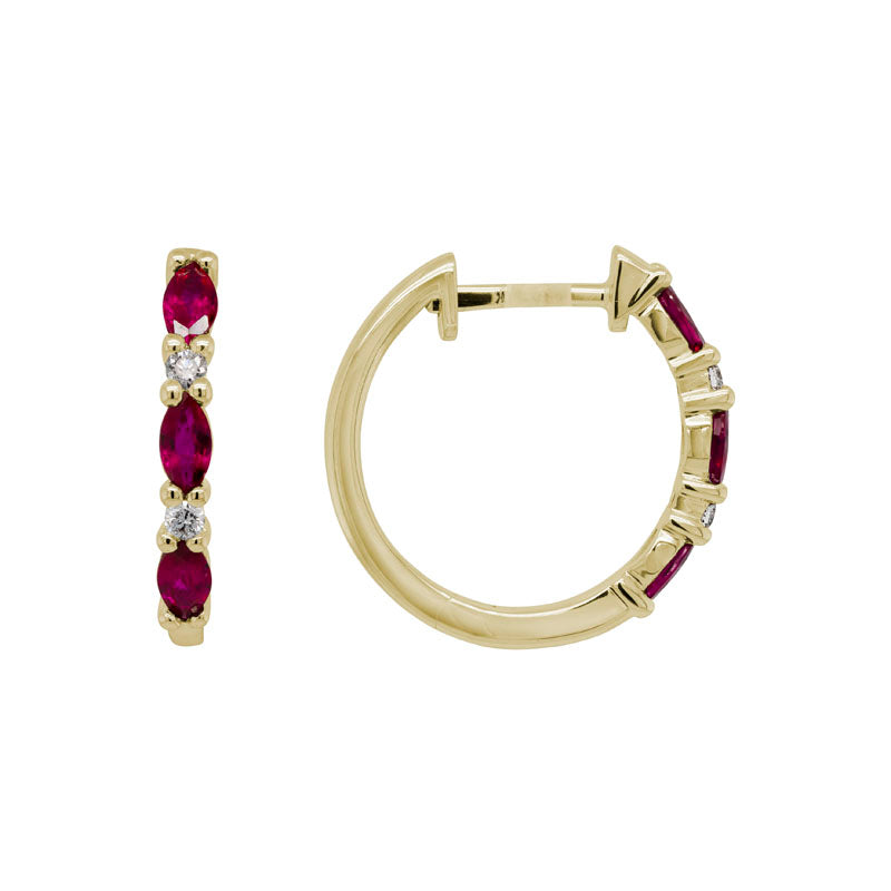 14K gold earrings. 17mm (length) x 2.2mm (width) and featuring ruby and diamond huggies with snap-post closure. 6 marquise rubies totaling 0.66 ct.; 4 round full-cut diamonds totaling 0.06 ct. Prong-set.