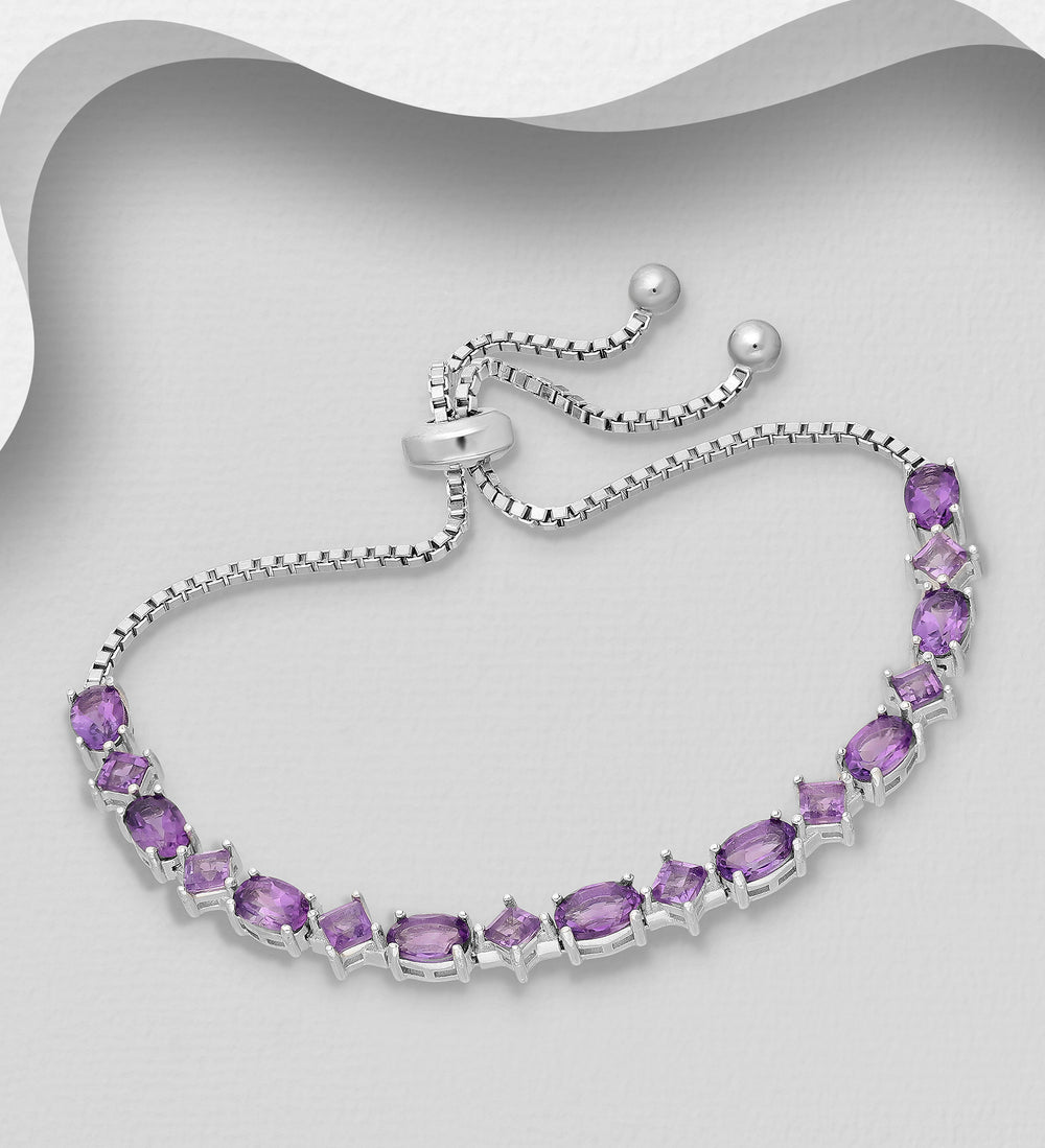 Amethyst is the birthstone for February and the gem for the 6th and 17th wedding anniversaries.This is a genuine Amethyst bracelet with a Bolo style clasp. It is fully adjustable from 6 inches to 9 inches in length.