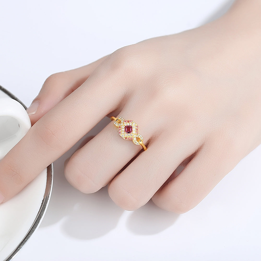 This is a sterling silver ring coated in 14K yellow gold. The main gemstone is a pink tourmaline simulant accented with diamond simulants.