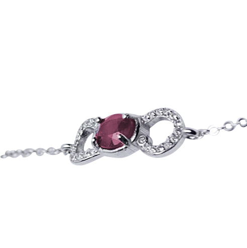 This bracelet is made in sterling silver and features a single ruby with diamond simulant accents.