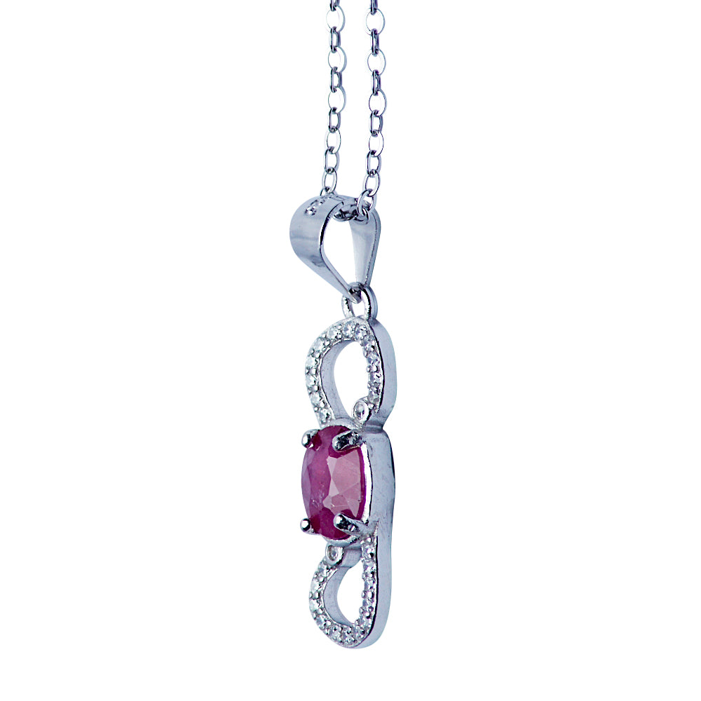 This pendant is made in sterling silver and features a single ruby with diamond simulant accents.