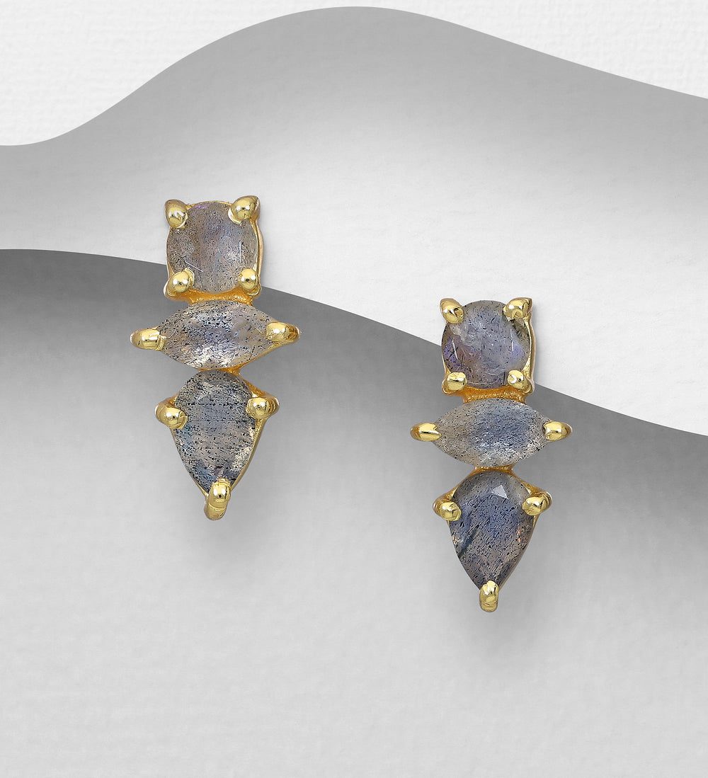 These earrings are made in sterling silver and coated with 14K yellow gold. The gemstone is labradorite.