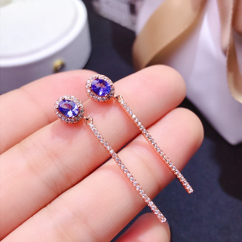 These are sterling silver earrings with a coating of 18K rose gold. The primary gemstone is natural tanzanite (0.5 ct per earring) and the accents are diamond simulants.