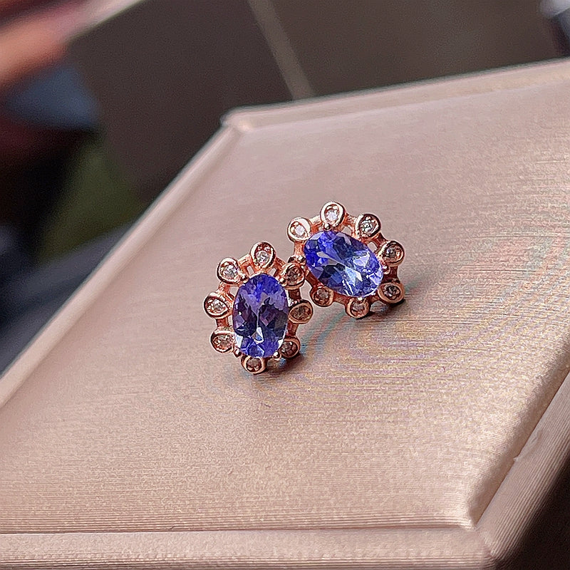 These are sterling silver earrings coated with 18K rose gold. The primary stone is natural tanzanite (0.5 ct each for a total of 1 cts) accented with diamond simulants.