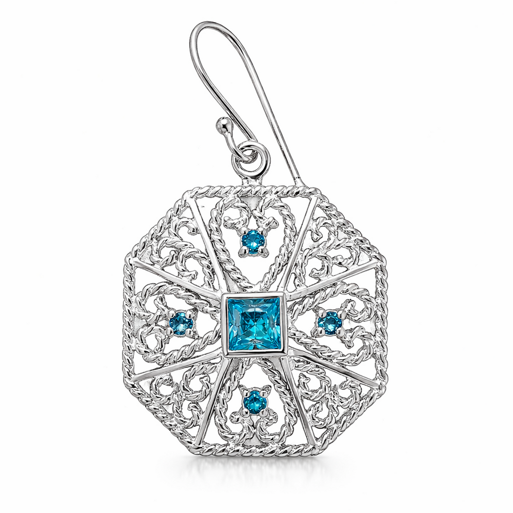 These elegant sterling silver blue topaz filigree earrings feature intricate vintage-inspired craftsmanship combined with vibrant gemstone sparkle. Designed with a beautifully detailed openwork pattern, the earrings showcase a brilliant 5 mm square-cut blue topaz at the center surrounded by delicate filigree scrollwork and accented with four 2 mm blue topaz stones that add subtle color and brilliance.