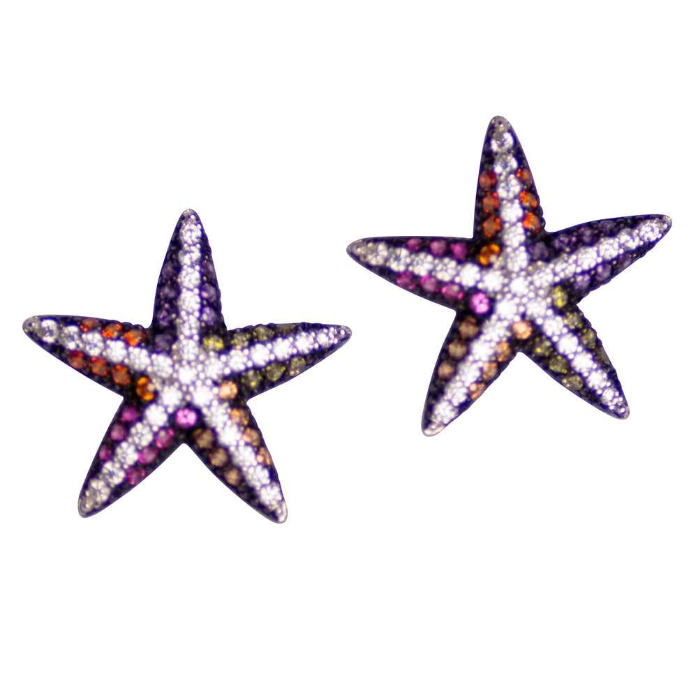 These are sterling silver starfish stud earrings. Each earring is encrusted in multi-colored crystals and is highly detailed. These are push back earrings for use on pierced ears.
