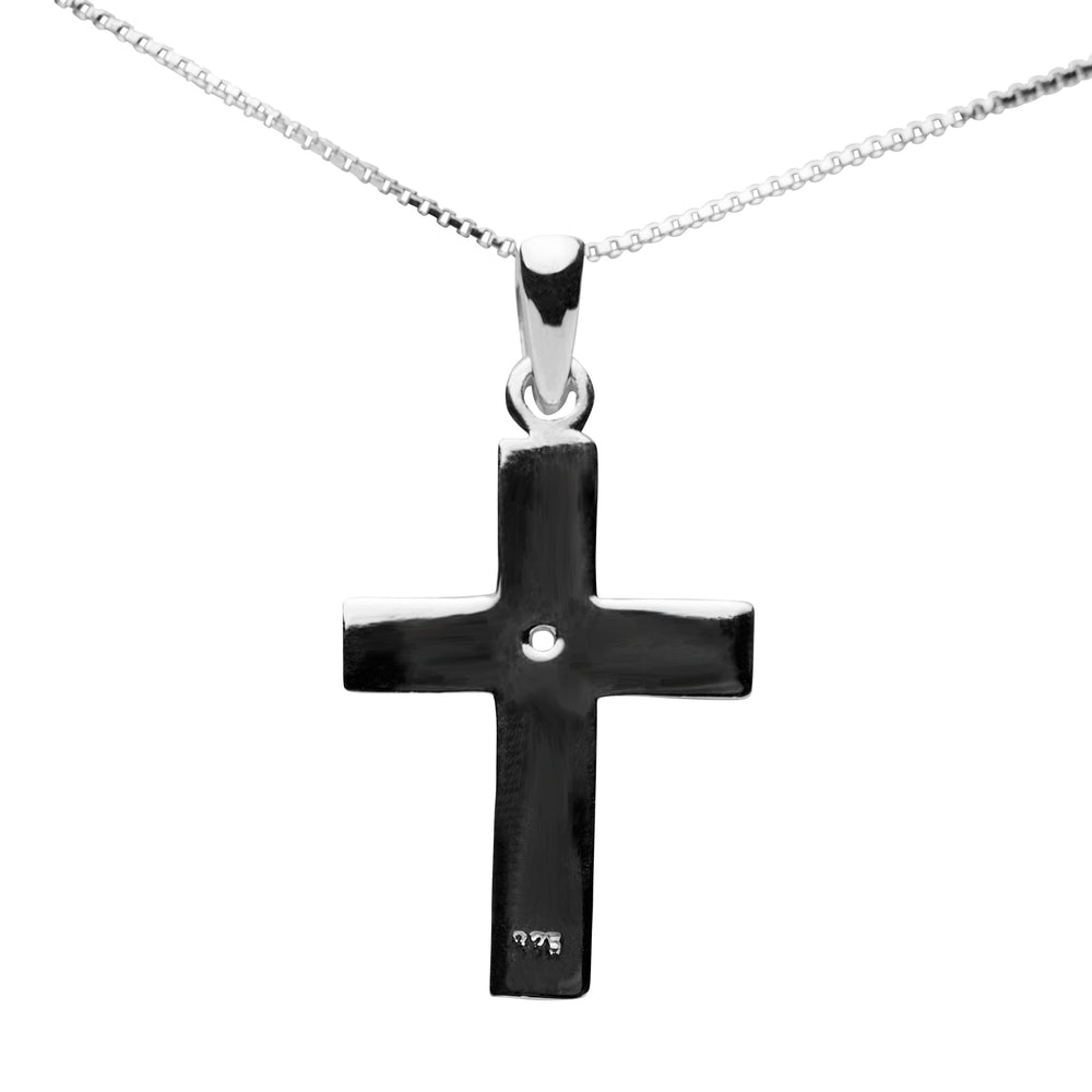 This simple sterling silver cross features a single crystal hand set in the center of the cross. This pendant is made in sterling silver and hallmarked 925. This pendant measures approximately 1.41 inches including bail and comes complete with a 16 inch sterling silver chain.